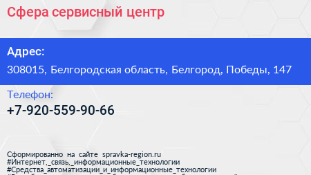 Сфера, сервисный центр по адресу 308015, Белгородская область, Белгород, Победы, 147 в дальнейшем Организация, размещена в следующих категориях: