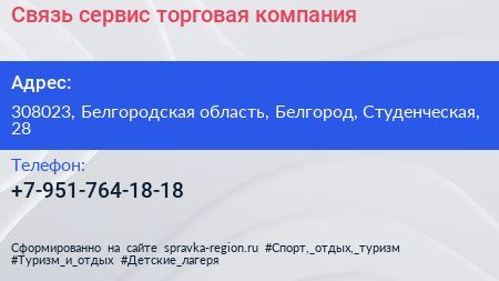 Связь-сервис, торговая компания по адресу 308023, Белгородская область, Белгород, Студенческая, 28 в дальнейшем Организация, размещена в следующих категориях: