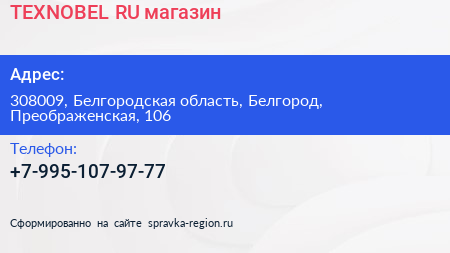 TEXNOBEL.RU, магазин по адресу 308009, Белгородская область, Белгород, Преображенская, 106 в дальнейшем Организация, размещена в следующих категориях: