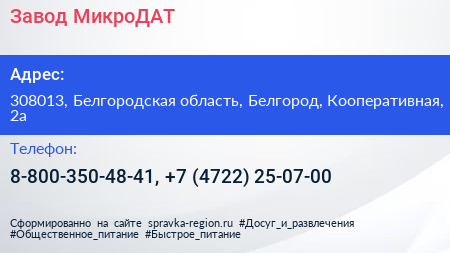 Завод МикроДАТ по адресу 308013, Белгородская область, Белгород, Кооперативная, 2а в дальнейшем Организация, размещена в следующих категориях: