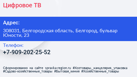 Цифровое ТВ по адресу 308031, Белгородская область, Белгород, бульвар Юности, 23 в дальнейшем Организация, размещена в следующих категориях: