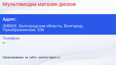 Мультимедиа, магазин дисков по адресу 308009, Белгородская область, Белгород, Преображенская, 106 в дальнейшем Организация, размещена в следующих категориях: