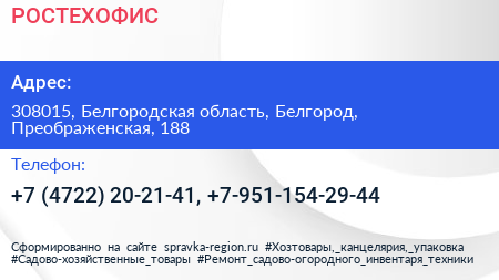 РОСТЕХОФИС по адресу 308015, Белгородская область, Белгород, Преображенская, 188 в дальнейшем Организация, размещена в следующих категориях:
