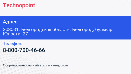 Technopoint по адресу 308031, Белгородская область, Белгород, бульвар Юности, 27 в дальнейшем Организация, размещена в следующих категориях: