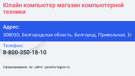 Юлайн компьютер, магазин компьютерной техники по адресу 308010, Белгородская область, Белгород, Привольная, 1г в дальнейшем Организация, размещена в следующих категориях: