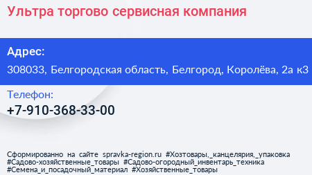 Ультра, торгово-сервисная компания по адресу 308033, Белгородская область, Белгород, Королёва, 2а к3 в дальнейшем Организация, размещена в следующих категориях: