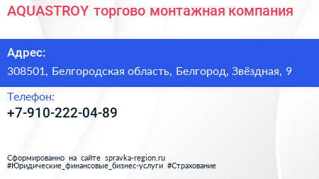AQUASTROY, торгово-монтажная компания по адресу 308501, Белгородская область, Белгород, Звёздная, 9 в дальнейшем Организация, размещена в следующих категориях:
