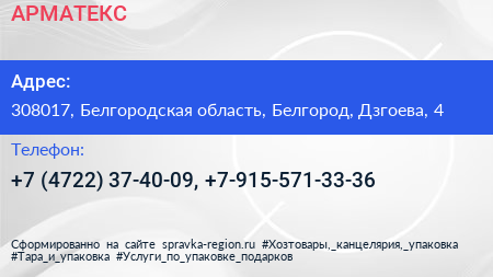 АРМАТЕКС по адресу 308017, Белгородская область, Белгород, Дзгоева, 4 в дальнейшем Организация, размещена в следующих категориях: