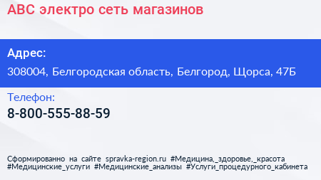 АВС-электро, сеть магазинов по адресу 308004, Белгородская область, Белгород, Щорса, 47Б в дальнейшем Организация, размещена в следующих категориях: