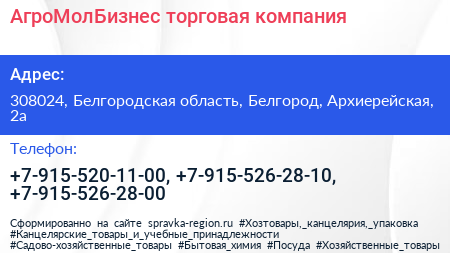 АгроМолБизнес, торговая компания по адресу 308024, Белгородская область, Белгород, Архиерейская, 2а в дальнейшем Организация, размещена в следующих категориях: