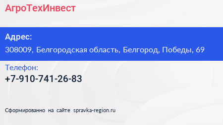 АгроТехИнвест по адресу 308009, Белгородская область, Белгород, Победы, 69 в дальнейшем Организация, размещена в следующих категориях: