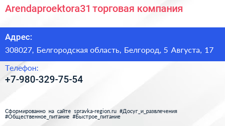 Arendaproektora31, торговая компания по адресу 308027, Белгородская область, Белгород, 5 Августа, 17 в дальнейшем Организация, размещена в следующих категориях: