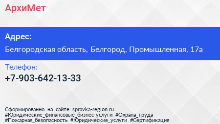 АрхиМет по адресу Белгородская область, Белгород, Промышленная, 17а в дальнейшем Организация, размещена в следующих категориях: