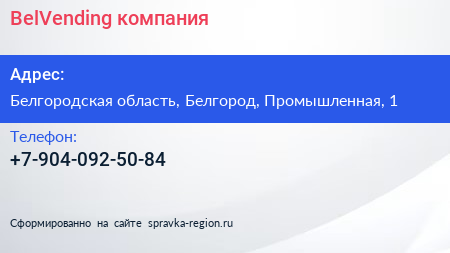 BelVending, компания по адресу Белгородская область, Белгород, Промышленная, 1 в дальнейшем Организация, размещена в следующих категориях: