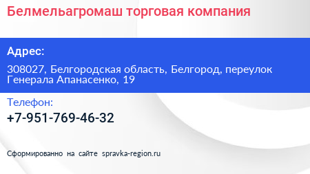 Белмельагромаш, торговая компания по адресу 308027, Белгородская область, Белгород, переулок Генерала Апанасенко, 19 в дальнейшем Организация, размещена в следующих категориях: