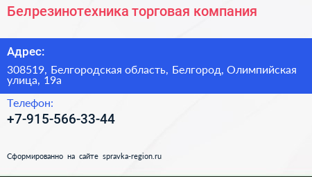 Белрезинотехника, торговая компания по адресу 308519, Белгородская область, Белгород, Олимпийская улица, 19а в дальнейшем Организация, размещена в следующих категориях: