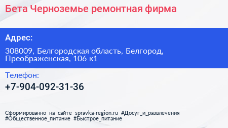 Бета-Черноземье, ремонтная фирма по адресу 308009, Белгородская область, Белгород, Преображенская, 106 к1 в дальнейшем Организация, размещена в следующих категориях: