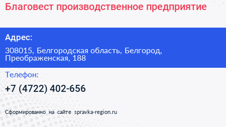 Благовест, производственное предприятие по адресу 308015, Белгородская область, Белгород, Преображенская, 188 в дальнейшем Организация, размещена в следующих категориях: