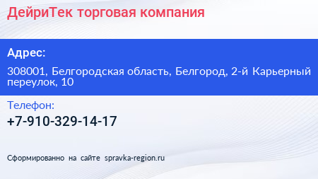 ДейриТек, торговая компания по адресу 308001, Белгородская область, Белгород, 2-й Карьерный переулок, 10 в дальнейшем Организация, размещена в следующих категориях: