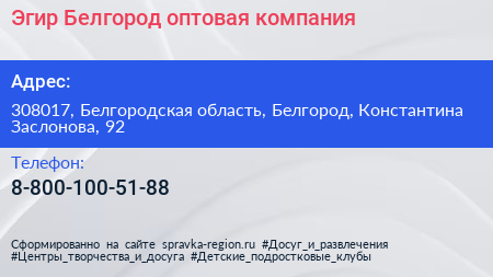 Эгир Белгород, оптовая компания по адресу 308017, Белгородская область, Белгород, Константина Заслонова, 92 в дальнейшем Организация, размещена в следующих категориях: