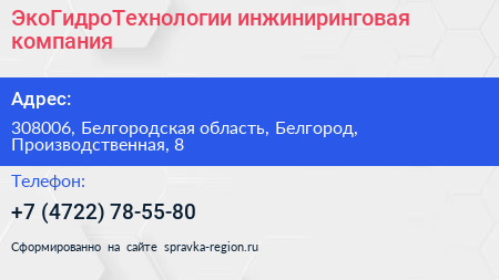 ЭкоГидроТехнологии, инжиниринговая компания по адресу 308006, Белгородская область, Белгород, Производственная, 8 в дальнейшем Организация, размещена в следующих категориях: