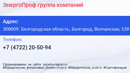 ЭнергоПроф, группа компаний по адресу 308009, Белгородская область, Белгород, Волчанская, 139 в дальнейшем Организация, размещена в следующих категориях: