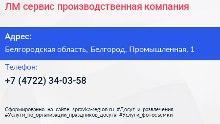 ЛМ сервис, производственная компания по адресу Белгородская область, Белгород, Промышленная, 1 в дальнейшем Организация, размещена в следующих категориях: