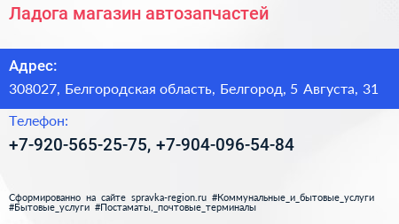 Ладога, магазин автозапчастей по адресу 308027, Белгородская область, Белгород, 5 Августа, 31 в дальнейшем Организация, размещена в следующих категориях: