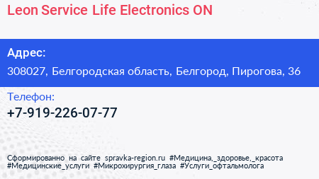 Leon Service Life Electronics ON по адресу 308027, Белгородская область, Белгород, Пирогова, 36 в дальнейшем Организация, размещена в следующих категориях: