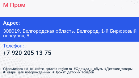 М-Пром по адресу 308019, Белгородская область, Белгород, 1-й Бирюзовый переулок, 9 в дальнейшем Организация, размещена в следующих категориях: