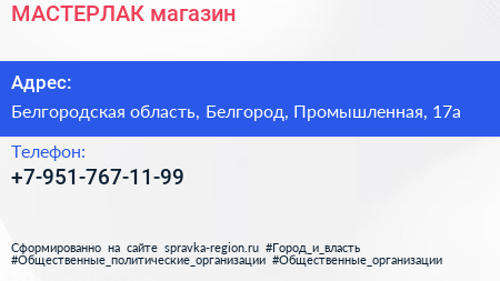 МАСТЕРЛАК, магазин по адресу Белгородская область, Белгород, Промышленная, 17а в дальнейшем Организация, размещена в следующих категориях: