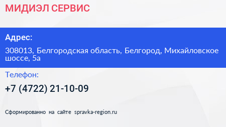 МИДИЭЛ-СЕРВИС по адресу 308013, Белгородская область, Белгород, Михайловское шоссе, 5а в дальнейшем Организация, размещена в следующих категориях: