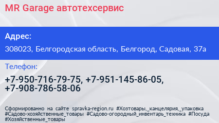 MR Garage, автотехсервис по адресу 308023, Белгородская область, Белгород, Садовая, 37а в дальнейшем Организация, размещена в следующих категориях: