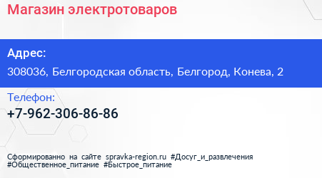 Магазин электротоваров по адресу 308036, Белгородская область, Белгород, Конева, 2 в дальнейшем Организация, размещена в следующих категориях: