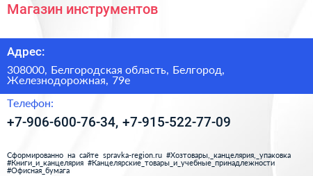 Магазин инструментов по адресу 308000, Белгородская область, Белгород, Железнодорожная, 79е в дальнейшем Организация, размещена в следующих категориях: