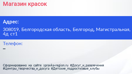 Магазин красок по адресу 308019, Белгородская область, Белгород, Магистральная, 4д ст1 в дальнейшем Организация, размещена в следующих категориях: