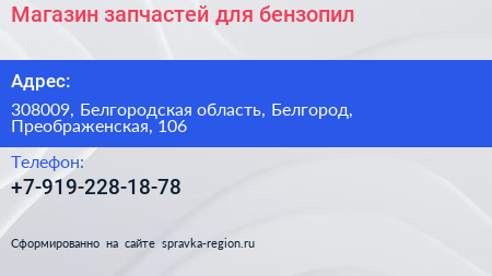 Магазин запчастей для бензопил по адресу 308009, Белгородская область, Белгород, Преображенская, 106 в дальнейшем Организация, размещена в следующих категориях: