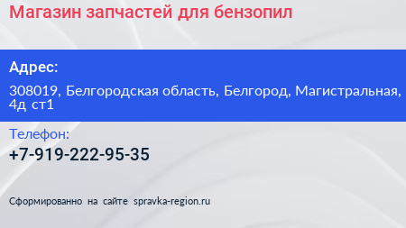 Магазин запчастей для бензопил по адресу 308019, Белгородская область, Белгород, Магистральная, 4д ст1 в дальнейшем Организация, размещена в следующих категориях: