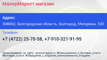 МалерМаркет, магазин по адресу 308002, Белгородская область, Белгород, Мичурина, 100 в дальнейшем Организация, размещена в следующих категориях: