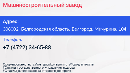 Машиностроительный завод по адресу 308002, Белгородская область, Белгород, Мичурина, 104 в дальнейшем Организация, размещена в следующих категориях:
