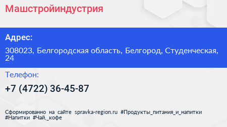 Машстройиндустрия по адресу 308023, Белгородская область, Белгород, Студенческая, 24 в дальнейшем Организация, размещена в следующих категориях: