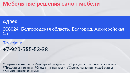 Мебельные решения, салон мебели по адресу 308024, Белгородская область, Белгород, Архиерейская, 5а в дальнейшем Организация, размещена в следующих категориях: