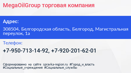 MegaOilGroup, торговая компания по адресу 308504, Белгородская область, Белгород, Магистральная переулок, 1а в дальнейшем Организация, размещена в следующих категориях: