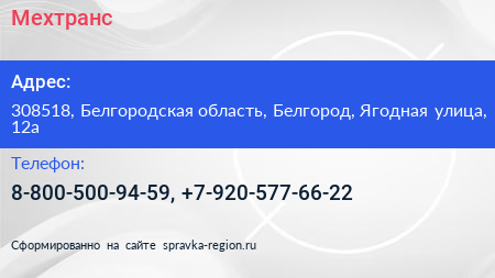 Мехтранс по адресу 308518, Белгородская область, Белгород, Ягодная улица, 12а в дальнейшем Организация, размещена в следующих категориях: