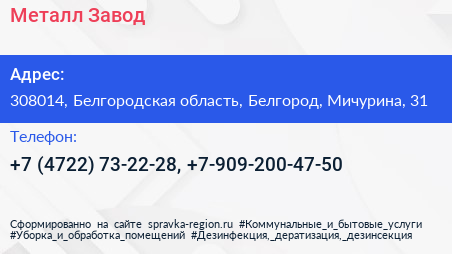 Металл-Завод по адресу 308014, Белгородская область, Белгород, Мичурина, 31 в дальнейшем Организация, размещена в следующих категориях: