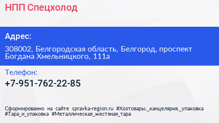 НПП Спецхолод по адресу 308002, Белгородская область, Белгород, проспект Богдана Хмельницкого, 111а в дальнейшем Организация, размещена в следующих категориях: