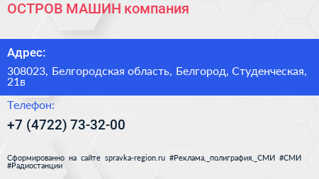 ОСТРОВ МАШИН, компания по адресу 308023, Белгородская область, Белгород, Студенческая, 21в в дальнейшем Организация, размещена в следующих категориях:
