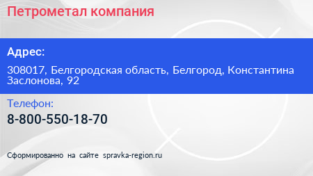 Петрометал, компания по адресу 308017, Белгородская область, Белгород, Константина Заслонова, 92 в дальнейшем Организация, размещена в следующих категориях: