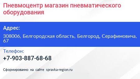Пневмоцентр, магазин пневматического оборудования по адресу 308006, Белгородская область, Белгород, Серафимовича, 67 в дальнейшем Организация, размещена в следующих категориях: