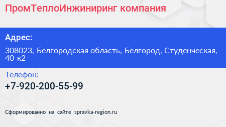 ПромТеплоИнжиниринг, компания по адресу 308023, Белгородская область, Белгород, Студенческая, 40 к2 в дальнейшем Организация, размещена в следующих категориях: